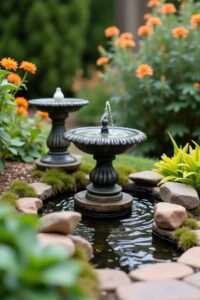 النوافير الصغيرة التي يمكن وضعها على الطاولة – كما في الصورة في الأسفل – خيار آخر رائع للمساحات الضيقة جدًا. ضع واحدة على طاولة الفناء أو رف الحديقة لتضيف إحساسًا هادئًا دون التضحية بالمساحة الأرضية للحديقة. إنها سهلة التركيب والصيانة، مما يجعلها مثالية للمبتدئين.