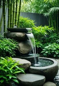 أحط نافورتك أو جدولك بالنباتات التي تزدهر في الظروف الرطبة، مثل السراخس أو الهوستا أو الأعشاب الزخرفية. هذا يخلق مظهرًا خصبًا وطبيعيًا يعزز التأثير العام. للحصول على مظهر أكثر حداثة، استخدم أوانيًا أنيقة من الحجر أو المعدن حول العنصر المائي للحفاظ على مظهر نظيف وعصري.